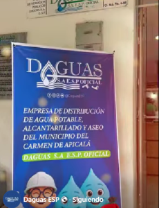 DAGUAS S.A. Es la Empresa de Distribución de Agua Potable, Alcantarillado y Aseo de Carmen de Apicalá.