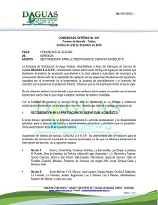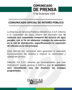 INFORMACIÓN DAGUAS S.A. E.S.P. informa la suspensión temporal del servicio de agua potable en el casco urbano, debido a trabajos de adecuación en la red