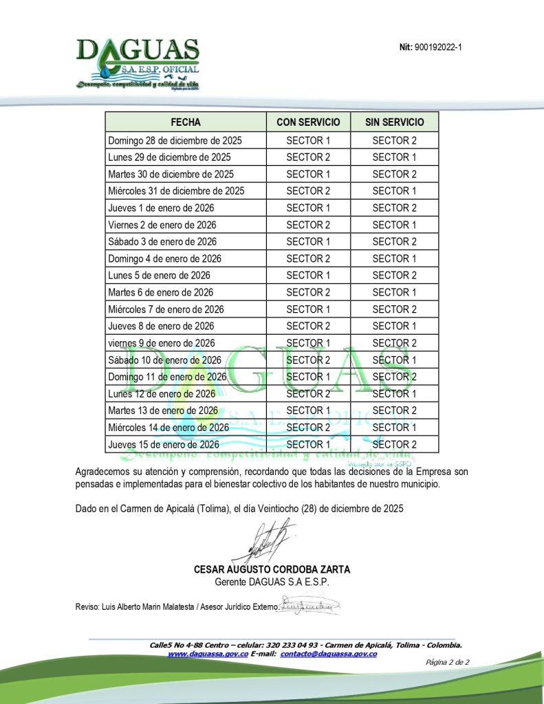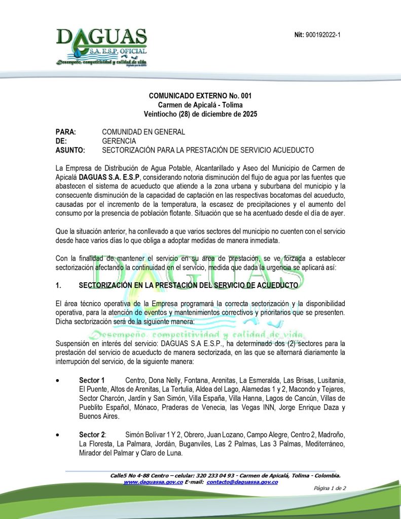 📢 DAGUAS S.A. E.S.P. informa a la comunidad del Carmen de Apicalá sobre la sectorización del servicio de acueducto debido a la baja disponibilidad de agua 💧 A partir de hoy, sectores específicos tendrán cortes programados para asegurar el suministro 🚰