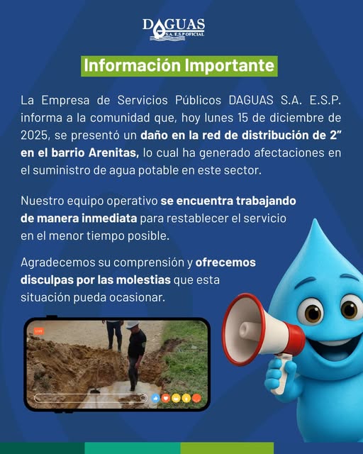 DAGUAS S.A. E.S.P. le informa a la comunidad que hoy lunes 15 de diciembre se presentó un daño en la red de distribución de 2”, lo cual ha generado afectaciones en el suministro de agua en el sector ![]()